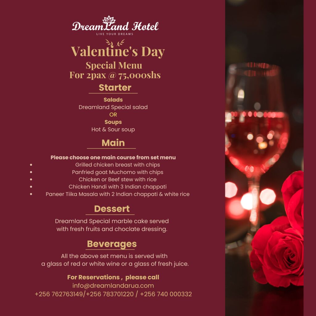 Celebrate this Valentine’s Day with your loved one at Dreamland Hotel. Enjoy a romantic getaway featuring a candlelight dinner with a glass of red or white wine, or fresh juice for two at 75,000 UGX, or a luxury room with scenic views and a special dinner for two at 275,000 UGX. Create magical moments in a serene setting designed for love. Book now and make this Valentine’s Day truly special and memorable.